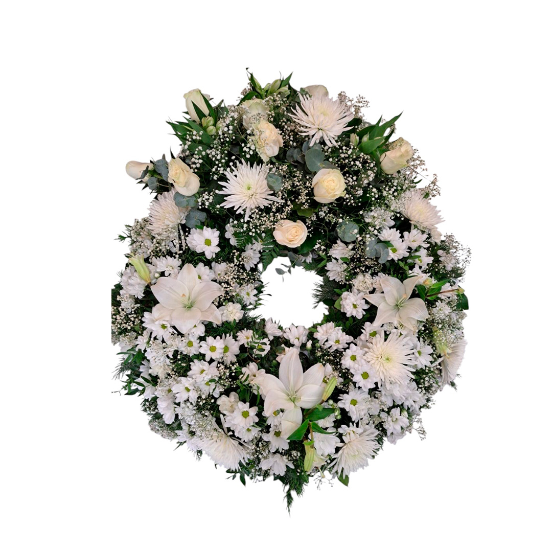 Corona de flores funeraria de gran elegancia y pureza, compuesta por lilium oriental blanco, rosas, crisantemos, margaritas y paniculata. Ideal para expresar respeto y cariño en momentos difíciles. Incluye cinta con dedicatoria y entrega urgente a tanatorios.