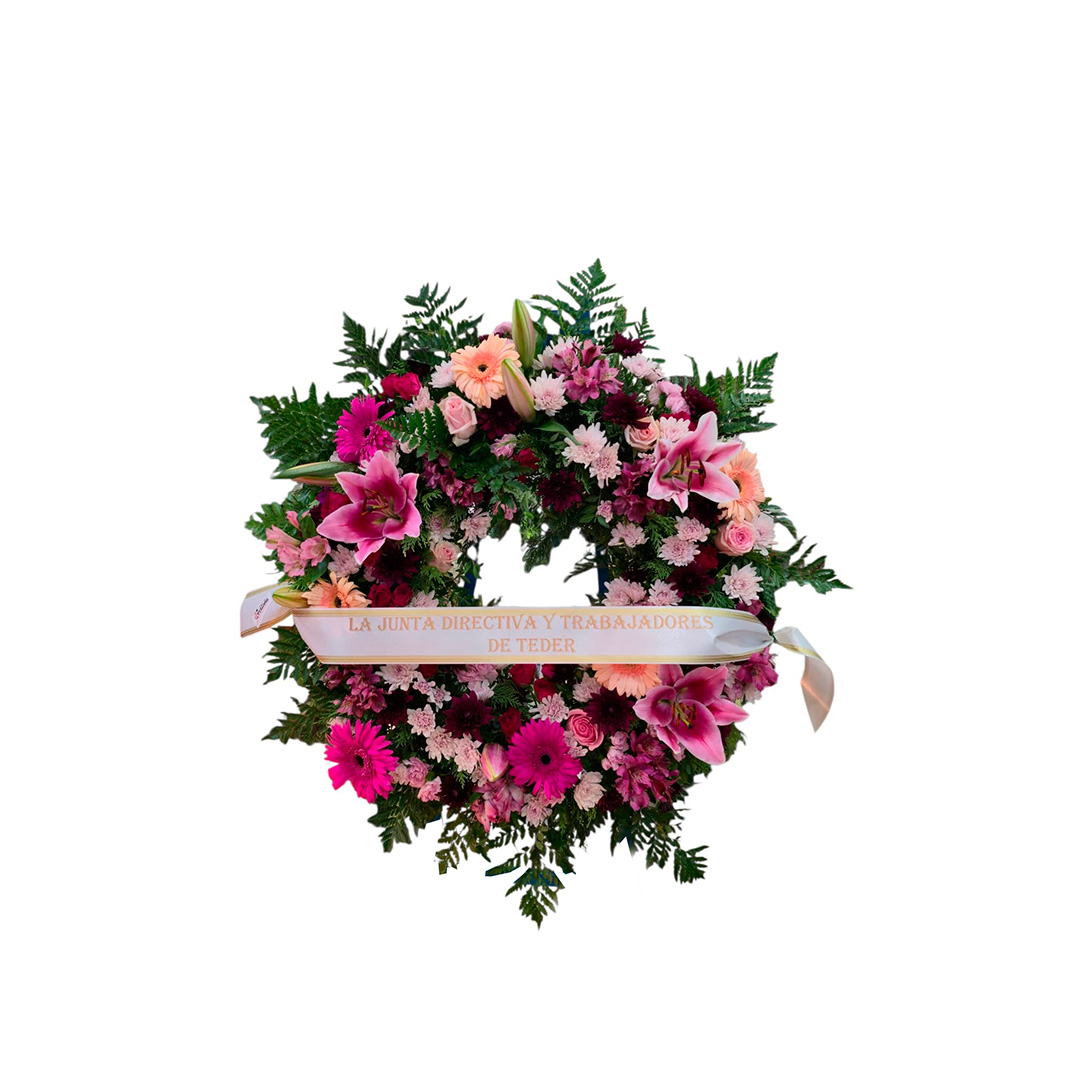 Corona de flores funeraria elaborada en delicados tonos rosas y fucsias con lilium oriental, gerberas, rosas y claveles. Una opción elegante y llena de ternura para rendir homenaje a un ser querido. Incluye cinta con dedicatoria personalizada y entrega rápida en tanatorios.