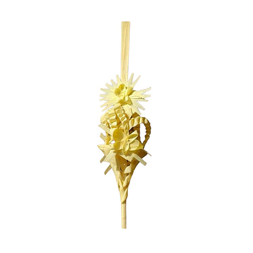 Esta palma artesanal está elaborada con hojas de palma cuidadosamente tejidas y trenzadas para crear un diseño elegante y simbólico, ideal para celebrar el Domingo de Ramos. Su estructura combina flores, trenzas y formas decorativas que reflejan la tradición y el trabajo manual de artesanos expertos.