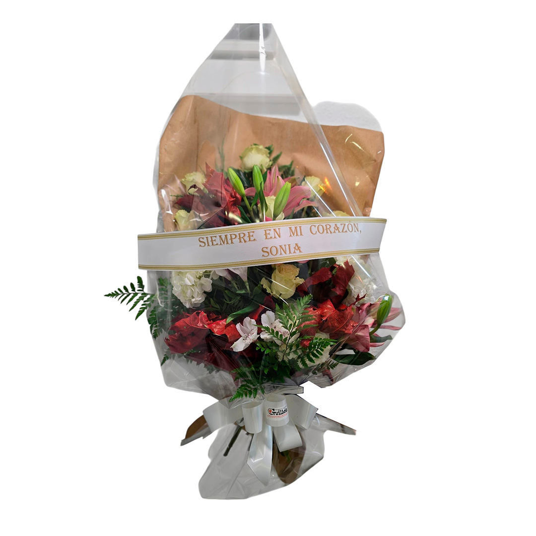 Este ramo funerario floral combina lirios rojos, rosas crema y flores blancas acompañadas de un delicado follaje verde, expresando respeto, cariño y recuerdo hacia ese ser querido que ya no está. La mezcla de colores transmite sentimientos de amor y paz. La banda personalizada con dedicatoria, como “Siempre en mi corazón, Sonia”, aporta un toque íntimo y emotivo, haciendo de este arreglo un homenaje sincero. Ideal para enviar en momentos de duelo con sensibilidad y afecto en Pamplona.